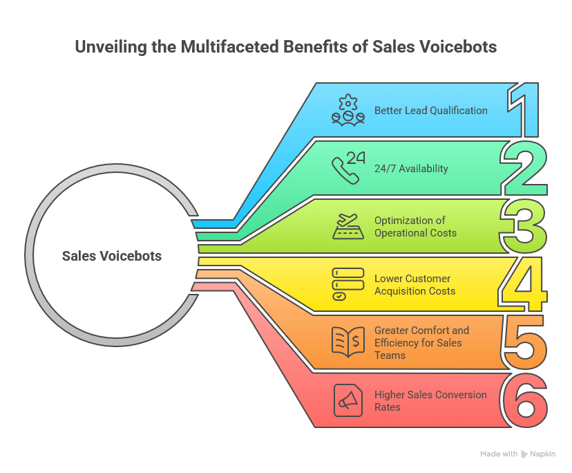 When implemented effectively, AI voicebots in B2B sales contribute to lowering customer acquisition costs, streamlining processes, and increasing sales efficiency. An AI system can handle multiple conversations simultaneously, meaning salespeople no longer need to perform repetitive prospecting activities manually. But that’s not all. The key benefits of using sales voicebots in B2B include: