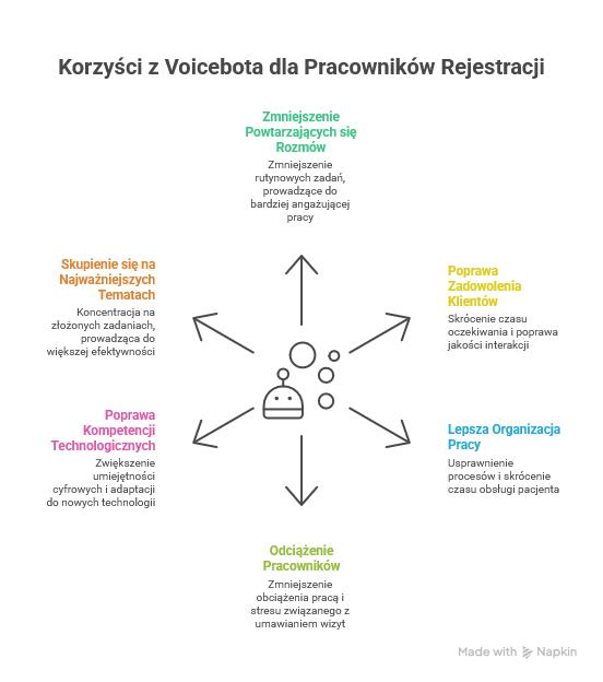 Najważniejsze korzyści odczuwane przez pracowników rejestracji po wdrożeniu voicebota to: