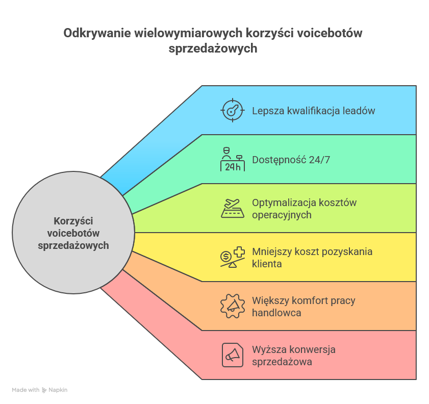 Umiejętne zastosowanie voicebota AI w sprzedaży B2B wpływa korzystnie na redukcję kosztów pozyskania klienta, a także usprawniają cały proces i zwiększają wydajność handlowca. Narzędzie AI jest w stanie prowadzić wiele rozmów jednocześnie, dzięki czemu sprzedawca nie musi wykonywać standardowych działań prospectingowych. Oczywiście to nie wszystko. Podstawowe korzyści voicebotów sprzedażowych w B2B to: